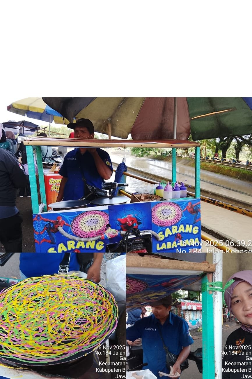 Salah satu pedagang yang telah lama berjualan di kawasan tersebut adalah Pak Mancung, penjual kue sarang laba-laba. Ia tetap setia menyusuri area bendung dengan gerobak kecilnya meski pendapatan kini tidak menentu. “Rezeki itu yang penting diupayakan. Tidak selalu banyak, yang penting halal dan berkah,” ujarnya sambil menyiapkan adonan di wajan yang sudah menua. Kue buatannya menjadi favorit anak-anak karena bentuknya unik dan proses memasaknya menarik.
