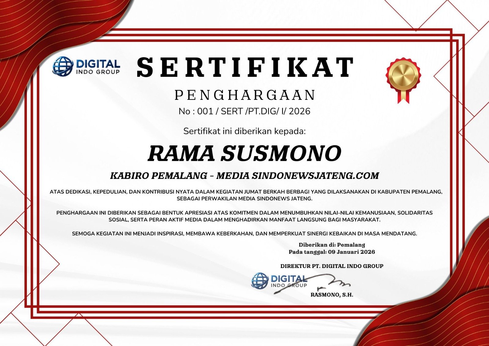 Kompos.web.id | Pemalang – Peran media dalam kegiatan sosial kemasyarakatan kembali mendapat perhatian melalui pemberian Sertifikat Penghargaan kepada Rama Susmono atas dedikasi dan kontribusinya dalam program Jumat Berkah Berbagi di Kabupaten Pemalang. Penghargaan tersebut diberikan kepada Rama Susmono sebagai perwakilan SINDONEWS Jateng.